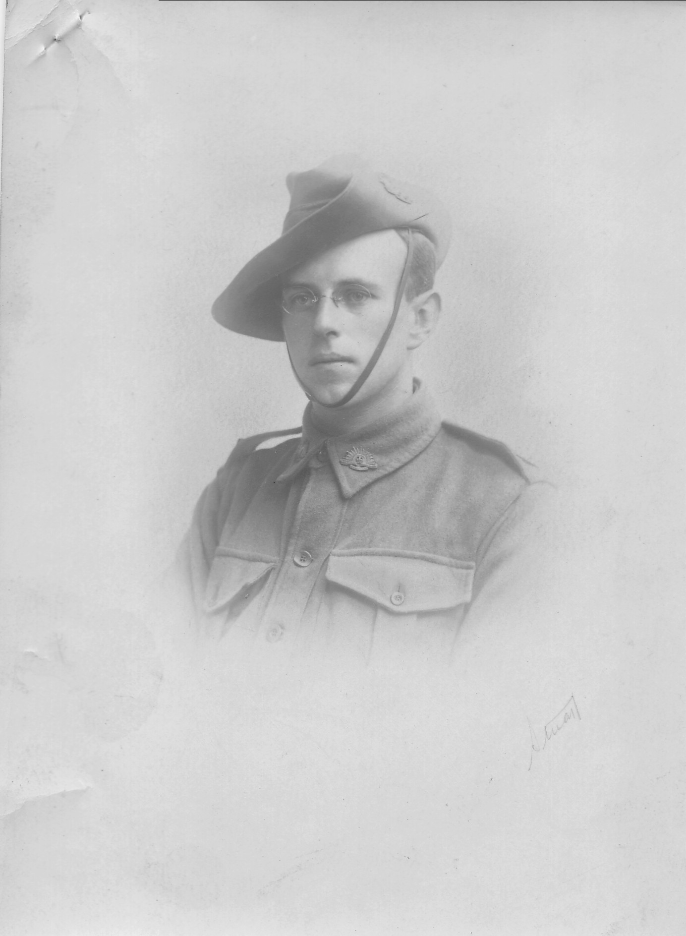 M.A. : Lance-Corporal, 1st Machine Gun Battn., A.I.F., France. Enlisting 27th May, 1916, and sailing 7th October, joined unit at Ypres in October, 1917, after training at Larkhill and Grantham. Took part in all engagements till invalided from Locre in February, 1918, rejoining coy. in June and serving till demobilisation. Early education at Bega, Sydney and Sydney Church of England Grammar Schools.