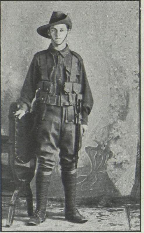 B.A. : Lieutenant, 1st Battn., A.I.F., Gallipoli and France. Enlisting 9th August, 1914, and sailing 18th October, was with battn. in Gallipoli from the Landing till the Evacuation, although wounded 8th August, 1915, and later invalided. In Egypt transferred to 1st Pioneer Battn. as sergeant, becoming company sergeant-major in France in April, 1916, and fought at 1st and 2nd Battles of Pozieres, Bullecourt, Lagnicourt, Passchendaele, Hazebrouck and Somme (1918), being gassed at Wyschaete. Then, having been regimental sergeant-major for 18 months, was sent to No. 5 Officer Cadet Battn., Cambridge, and commissioned in January, 1919, serving until demobilisation. Early education at Bathurst High School. Later at Teachers'' College.