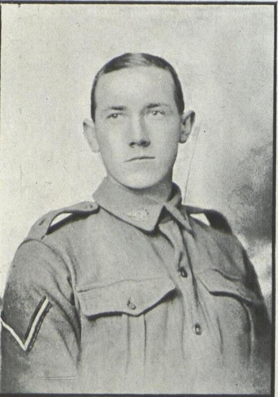 Arts I : Corporal, 2nd Battn, A.I.F., Gallipoli. Enlisting in August, 1914, and sailing in October, proceeded to Anzac from Egypt and served till death. Killed in Action, Anzac Landing, 25th April, 1915